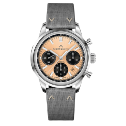 Dial Peach-coloured dial with sunray finish White tachymeter scale on black outer ring Black counters at 3, 6 and 9 o’clock Diamond-cut flat indexes, with white printing and white Super-LumiNova® Date window between 4 o’clock and 5 o’clock Anthracite NORQAIN logo Diamond-cut faceted hour and minute hands, filled with white Super-LumiNova® Diamond-cut flat central second counter Diamond-cut flat small counter hands