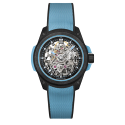 Dial Openworked black dial with sky blue printings Diamond-cut flat skeleton rhodium plated indexes, with sky blue X1 Super-LumiNova® spots Diamond-cut faceted hour and minute hands, rhodium plated, sky blue X1 Super-LumiNova®-filled tip Diamond-cut flat second hand, rhodium plated, white X1 Super-LumiNova®-filled tip, sky blue outlined tip