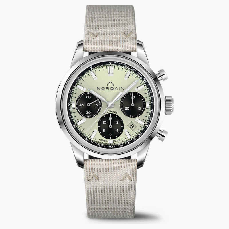 Cadran Cadran galbé de couleur pistache avec finition rayon de soleil Echelle tachymétrique blanche sur un anneau extérieur noir Compteurs noirs à 3, 6 et 9 heures Index plats taillés au diamant, avec impression blanche, et index Super-LumiNova® blancs Guichet jour/date 4 et 5 heures Logo NORQAIN anthracite Aiguilles des heures et des minutes facettées et taillées au diamant, revêtues de Super-LumiNova® blanc Trotteuse centrale plate, taillée au diamant Petites aiguilles de compteur plates et taillées au diamant