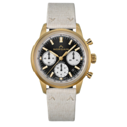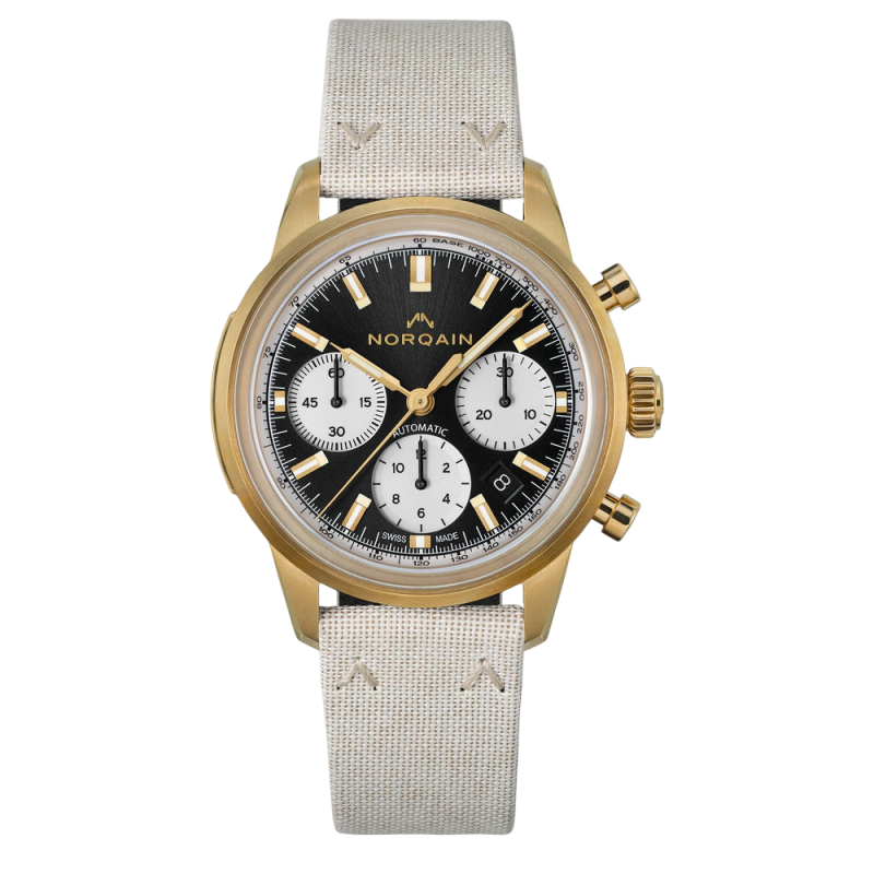 Cadran Cadran galbé noir avec finition rayon de soleil Echelle tachymétrique noire sur un anneau extérieur blanc 3 compteurs blancs à 3, 6 et 9 heures Index plats sablés, couleur bronze, avec impression blanche et index Superluminova old radium Guichet jour/date 4 et 5 heures Logo NORQAIN en bronze Aiguilles des heures et des minutes facettées et sablées, couleur bronze, remplies de Superluminova old radium Deuxième compteur central plat sablé, plaqué couleur bronze Petites aiguilles plates des trois compteurs et taillées au diamant, de couleur noire
