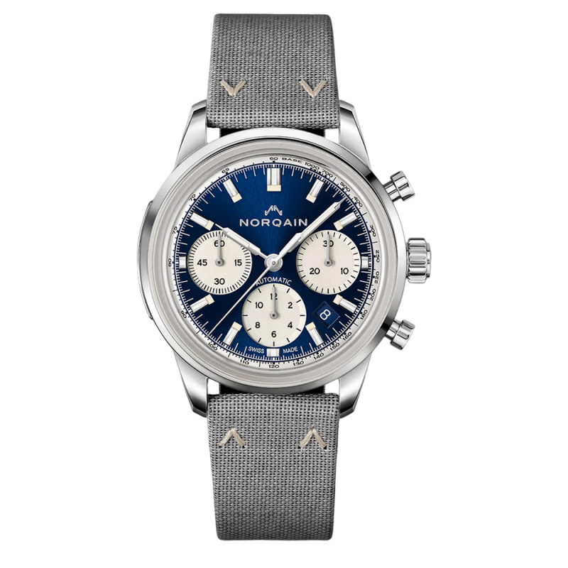 Cadran Cadran galbé bleu avec finition rayon de soleil Echelle tachymétrique noire sur anneau extérieur blanc 3 compteurs blancs à 3, 6 et 9 heures Index plats sablés, avec impression blanche et index Superluminova old radium Guichet jour/date 4 et 5 heures Logo NORQAIN couleur rhodium Aiguilles des heures et des minutes facettées et taillées au diamant, revêtues de Superluminova old radium Trotteuse centrale plate, taillée au diamant Petites aiguilles de compteur plates et taillées au diamant