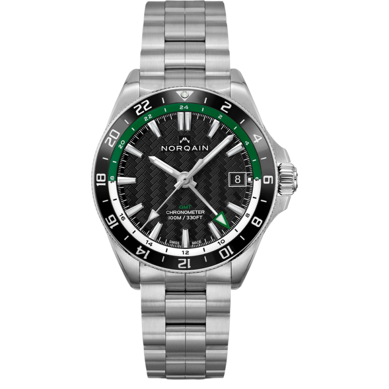 Cadran Cadran noir avec motif NORQAIN unique Deuxième fuseau horaire avec indication des 24 heures sur la bague verte et blanche entourant le cadran Guichet date à 3 heures Index plats facettés taillés au diamant, index revêtus de Superluminova au vieux radium Logo NORQAIN de couleur blanche Aiguilles des heures et des minutes facettées et taillées au diamant, revêtues de Superluminova old radium Trotteuse centrale plate taillée au diamant, pointe recouverte de Superluminova X1 Aiguille GMT plate, taillée au diamant, à la pointe bleue